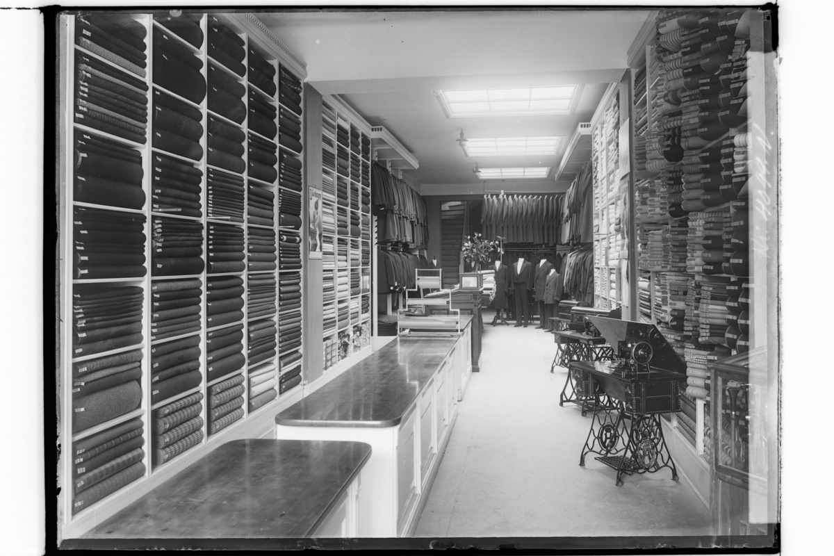 Nya Klädeshandeln, affärsinteriör, kläder, stuvar och symaskiner.