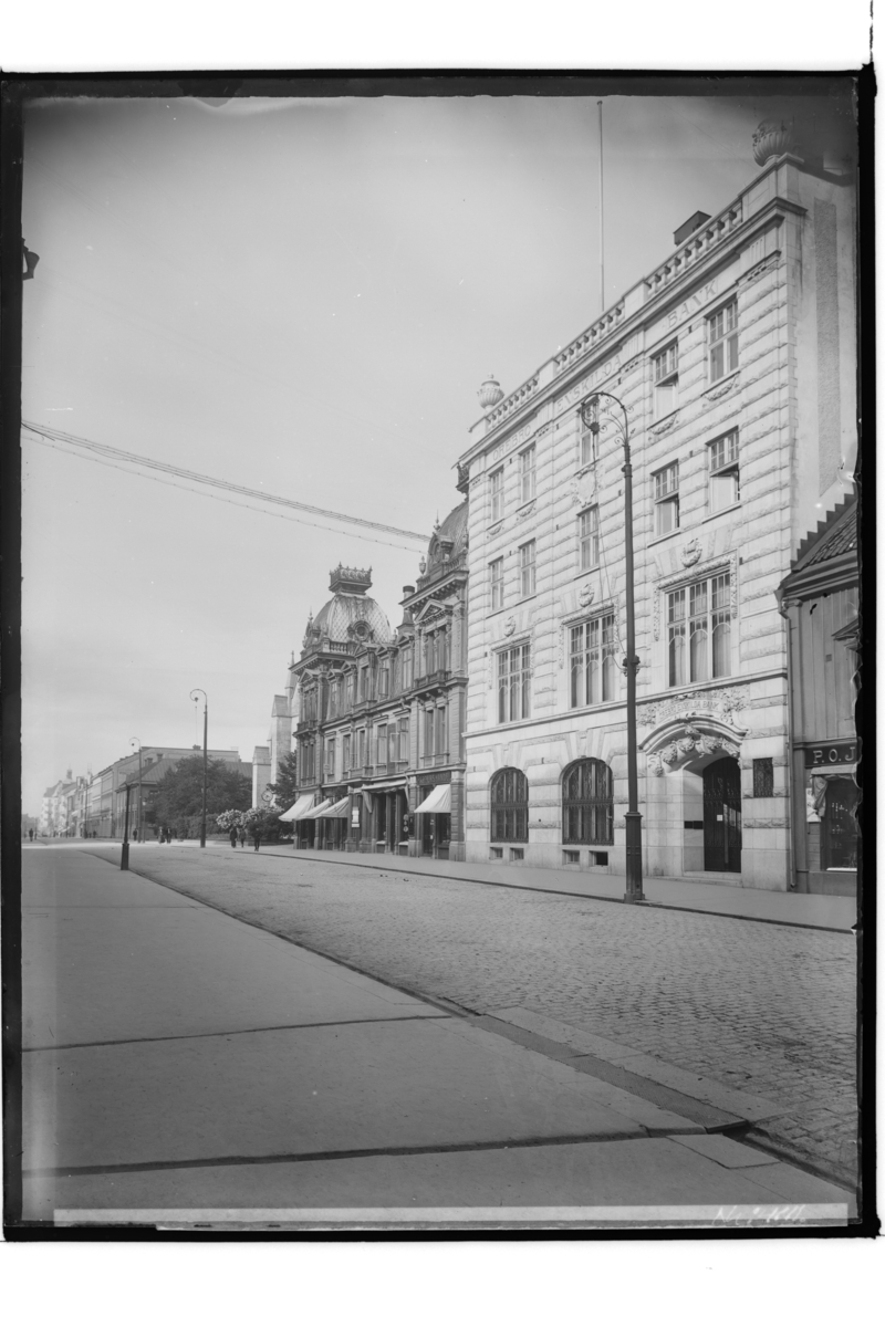 Örebro Enskilda Banken, stenhus i fyra våningar med barockpräglad fasad i ekebergsmarmor.