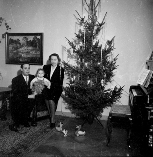 Rumsinteriör, familjegrupp tre personer vid julgranen.
