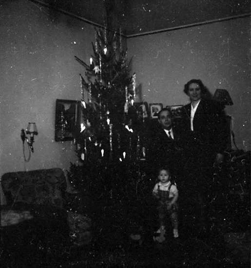 Rumsinteriör, familjegrupp tre personer vid julgranen.