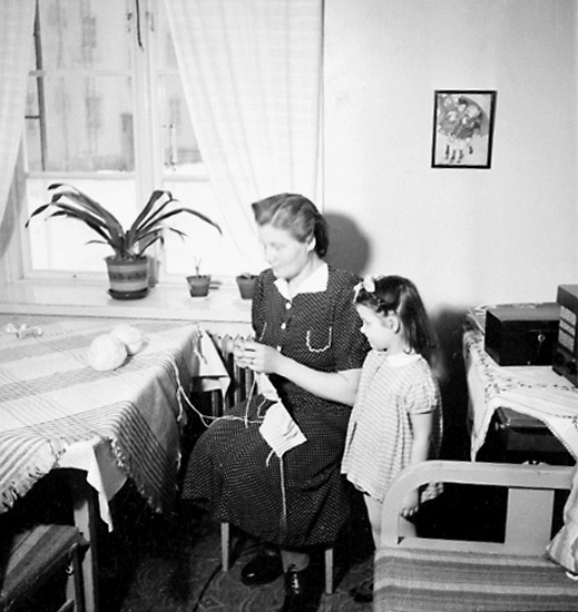 Rumsinteriör, stickning, en kvinna och en liten flicka.