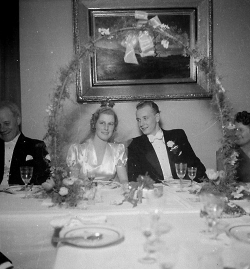 Titel: Rumsinteriör, bröllop, brudpar och bröllopsgäster vid bordet. Widestrand