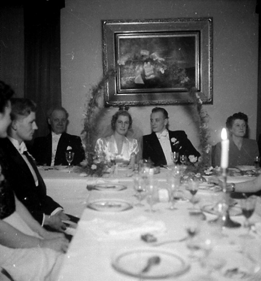 Rumsinteriör, bröllop, brudpar och bröllopsgäster vid bordet.