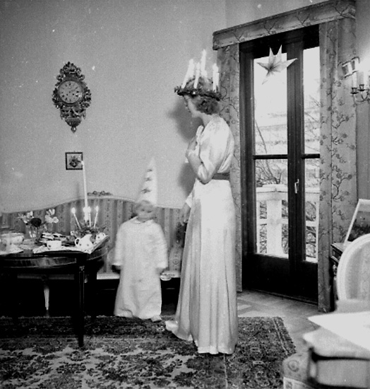 Titel: Rumsinteriör, Lucia och stjärngosse. Fru Larsson