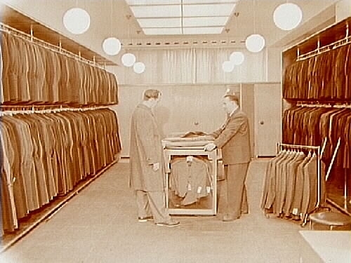 Konsum, affärsinteriör, herrkonfektion.