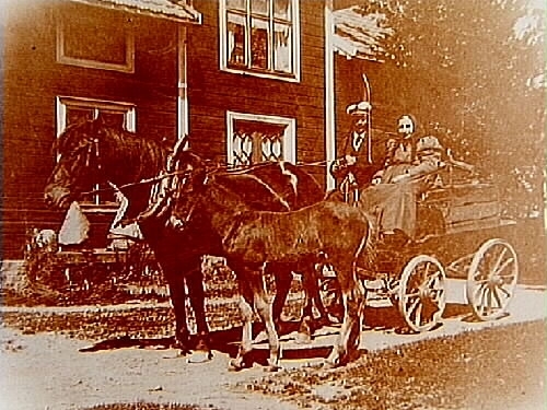 Häst spänd för trilla med två personer, ett föl vid sidan av stoet.
