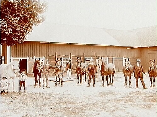 Ekonomibyggnader, 7 hästar, 4 män och 2 barn framför stallet.