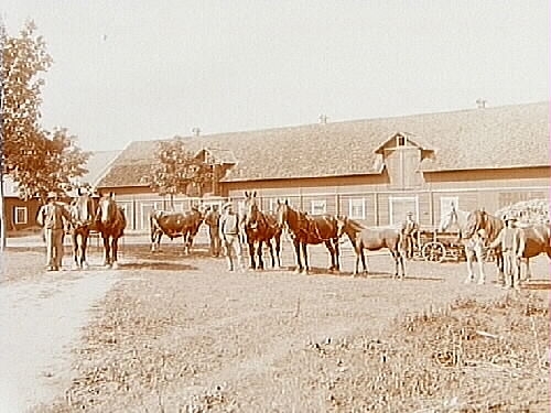 Ekonomibyggnader, 6 hästar, ett föl och en oxe. Fem män.