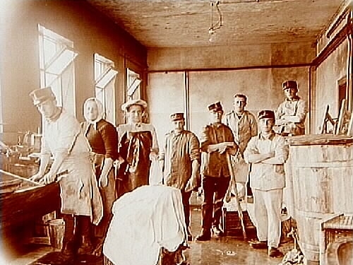 Kungliga Svea Trängkår, tvättstugeinteriör, 6 soldater och 2 kvinnor.