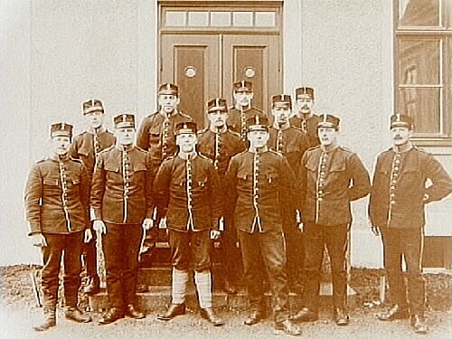 Kungliga Svea Trängkår, soldatgrupp framför byggnad, 11 soldater.