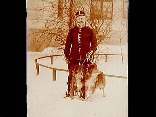 En soldat med två hundar.