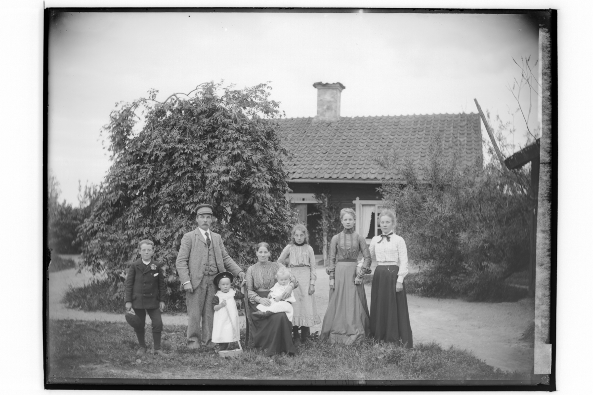 Envånings bostadshus, 8 personer framför huset.