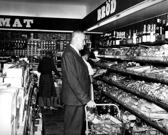 Konsum, affärsinteriör, tre kunder som handlar.