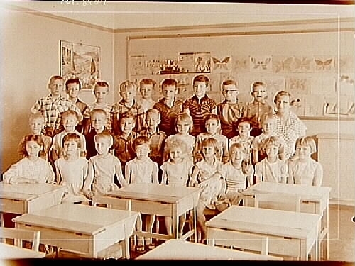 Klassrumsinteriör, skolbarn med lärarinna fru Astrid Wiberg, sal 11 E.
