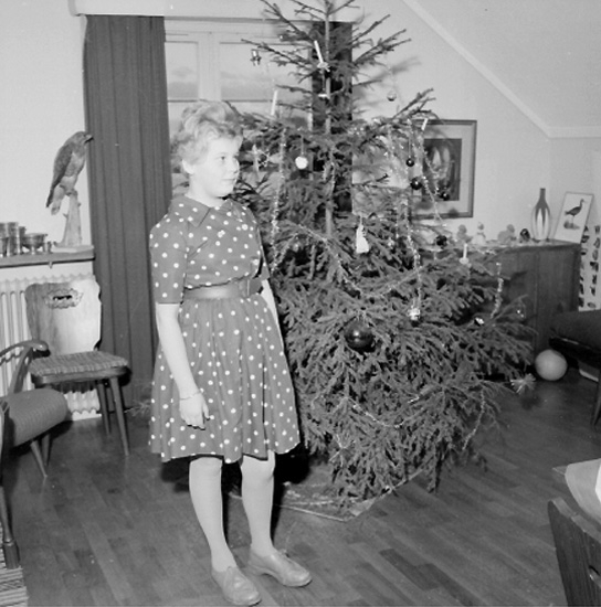 Rumsinteriör, en flicka vid julgranen.
