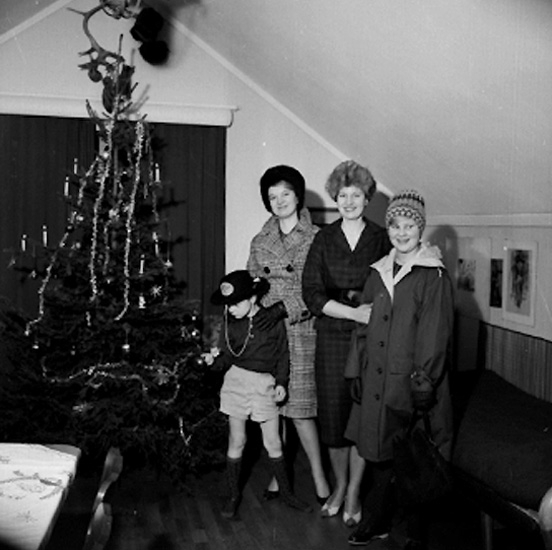 Rumsinteriör, familjegrupp fyra personer vid julgranen.