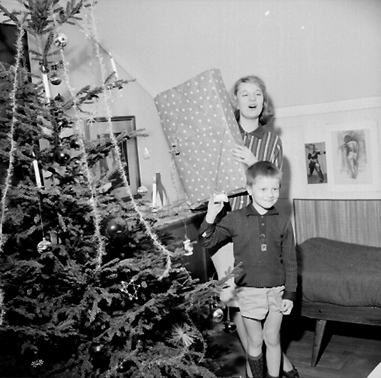 Rumsinteriör, en flicka och en pojke vid julgranen.