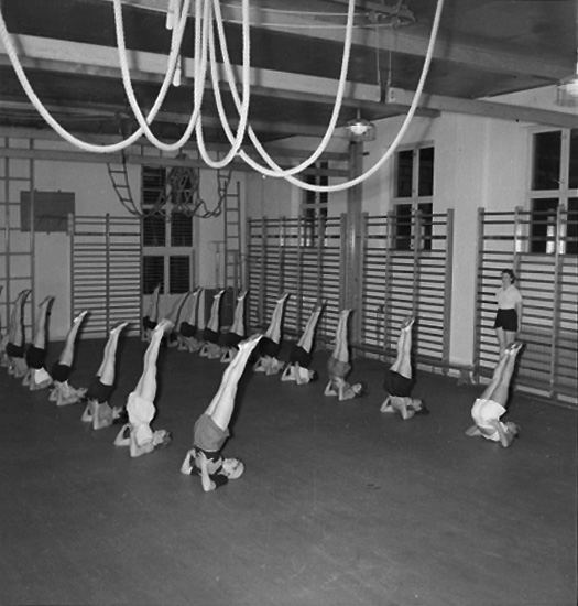 Interiör av gymnastiksal, Örebro Arbetarnas Gymnastikförening (Ö.A.G.F.), gymnastiktrupp.