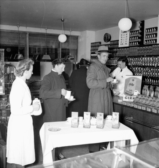 Konsum Special, affärsinteriör, kaffedrickande.