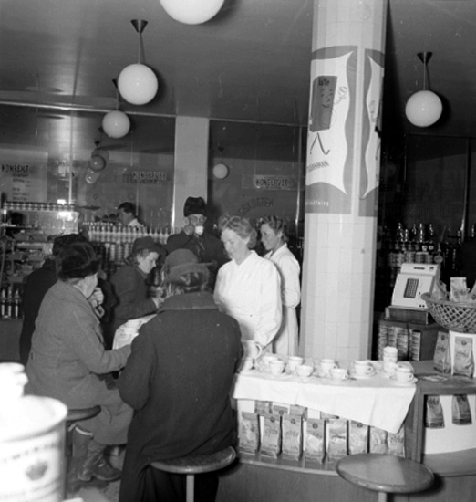 Konsum Special, affärsinteriör, kaffedrickande.