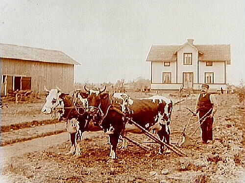 En och en halvvånings bostadshus med frontespis, ekonomibyggnader.