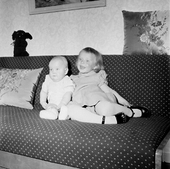 Rumsinteriör, två barn i soffan.