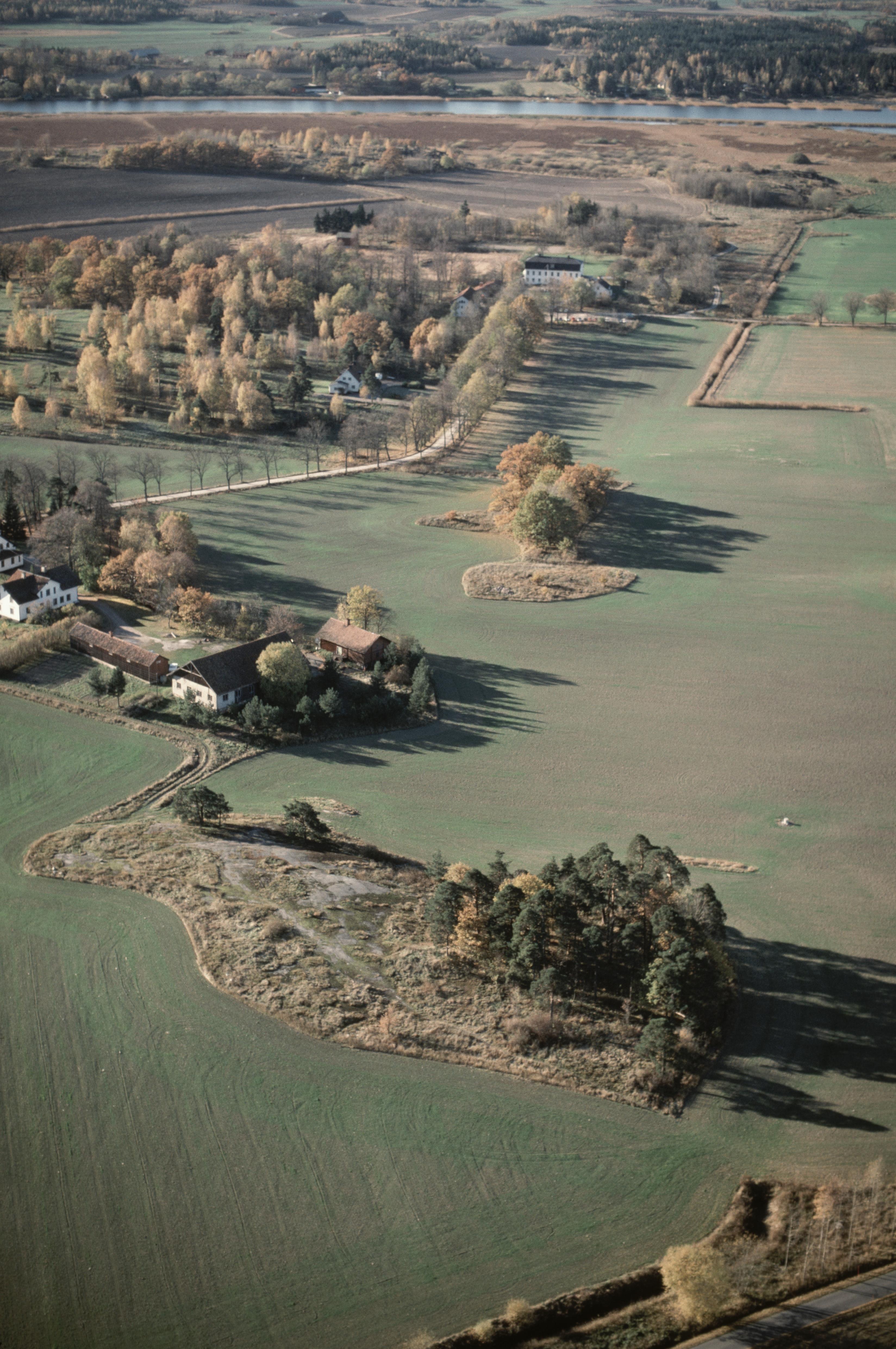 (Tid. Östra Eneby socken). Hällristningar RAÄnr Östra Eneby 23:1, 29:1-3, 77:1-3, 156:1 m.fl. vid Ekenberg (nere till vänster) och Leonardsbergs herrgård (över bildens mitt). Motala ström i bildens övre del. Bilden är tagen mot (väderstreck): SV