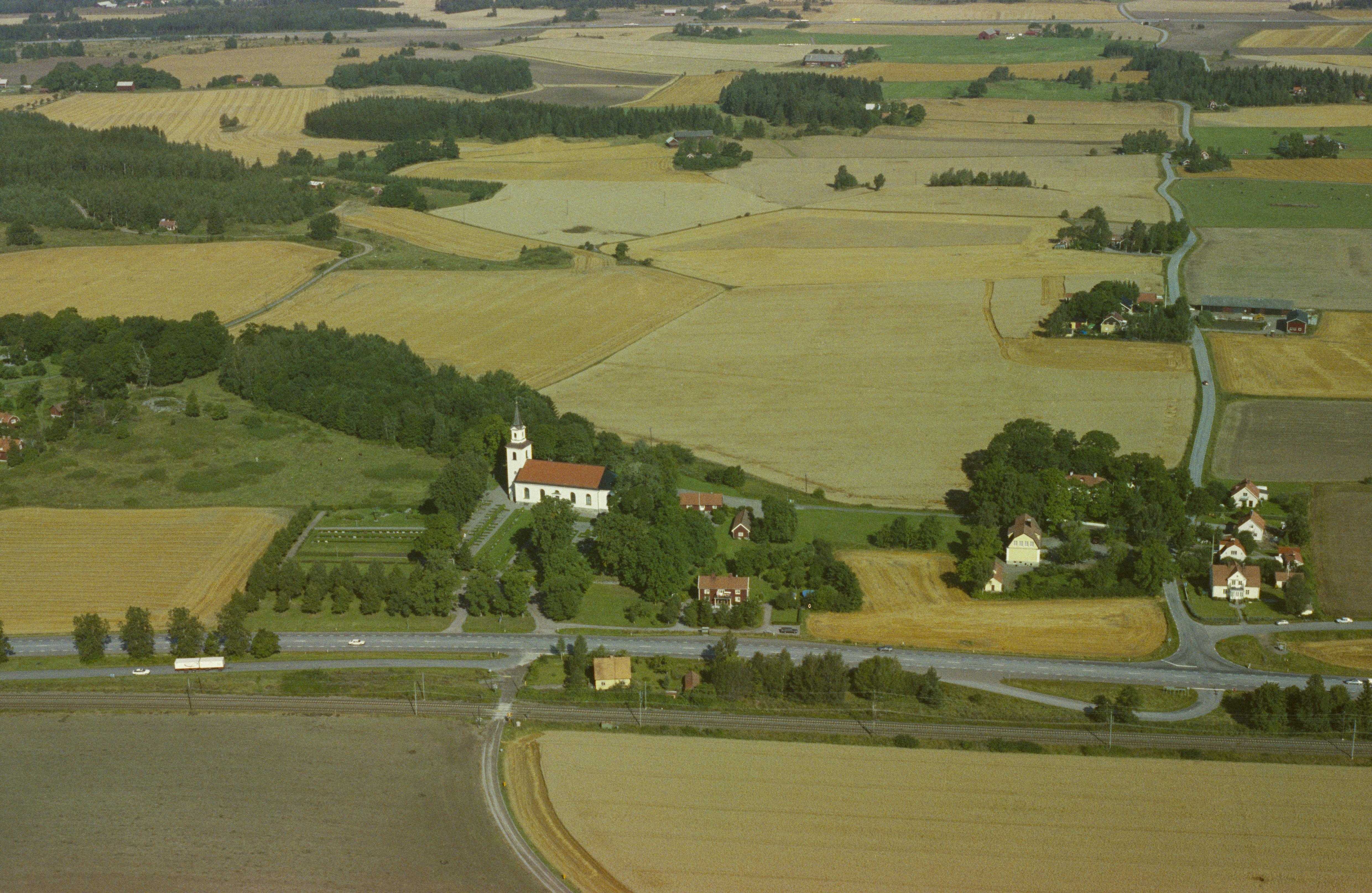 Törnevalla kyrka och kyrkby vid bildens mitt. Vid kyrkan gravfält RAÄnr Törnevalla 64:1 m.fl. . Bilden är tagen mot (väderstreck): NV