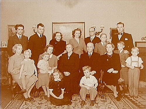 Rumsinteriör, släktgrupp 11 vuxna och 7 barn.