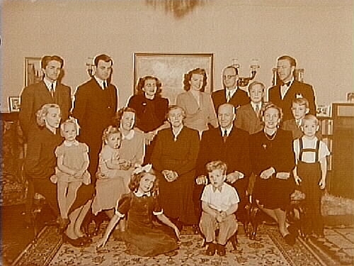 Rumsinteriör, släktgrupp 11 vuxna och 7 barn.