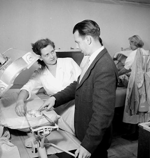 Konsums herrtvätt, interiör, två kvinnor och en man.