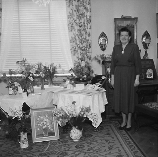 Titel: Rumsinteriör, en kvinna. Lisa Alvbrant på 50-årsdagen.