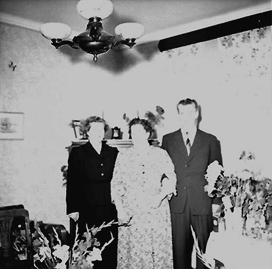Rumsinteriör, släktgrupp tre personer, högtid.