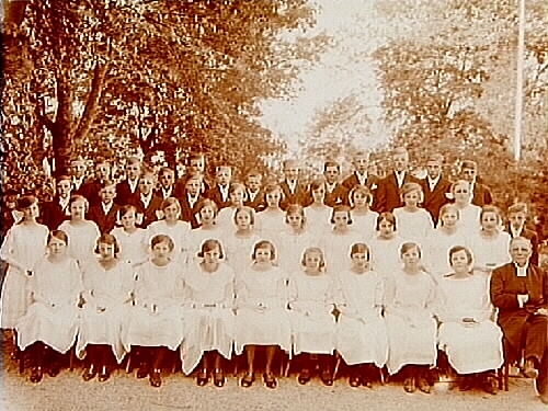 Almby konfirmander, 26 flickor, 18 pojkar och prästen.