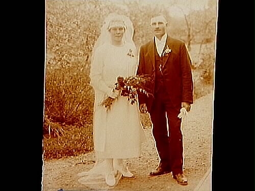 Brudpar, bruden helt i vitt, med lång slöja, brudgummen i mörk kostym.