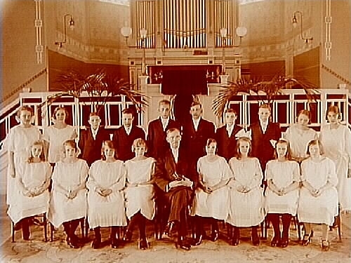 Konfirmander, 12 flickor, 6 pojkar och pastor Friberg.
