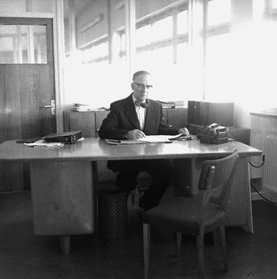 Titel: Kontorsinteriör, en man vid skrivbordet. Konsum.