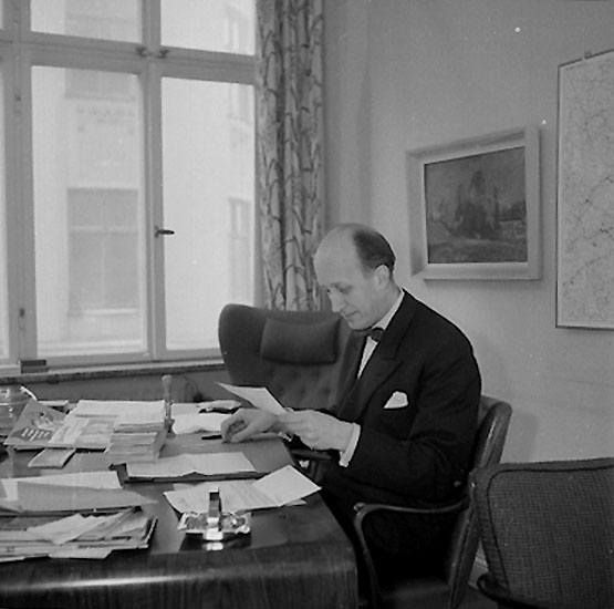 Gustafsson & Görtz, kontorsinteriör. Vid skrivbordet kamrer Gert Torpfeldt som jobbade i många år på Gustafsson & Görtz.