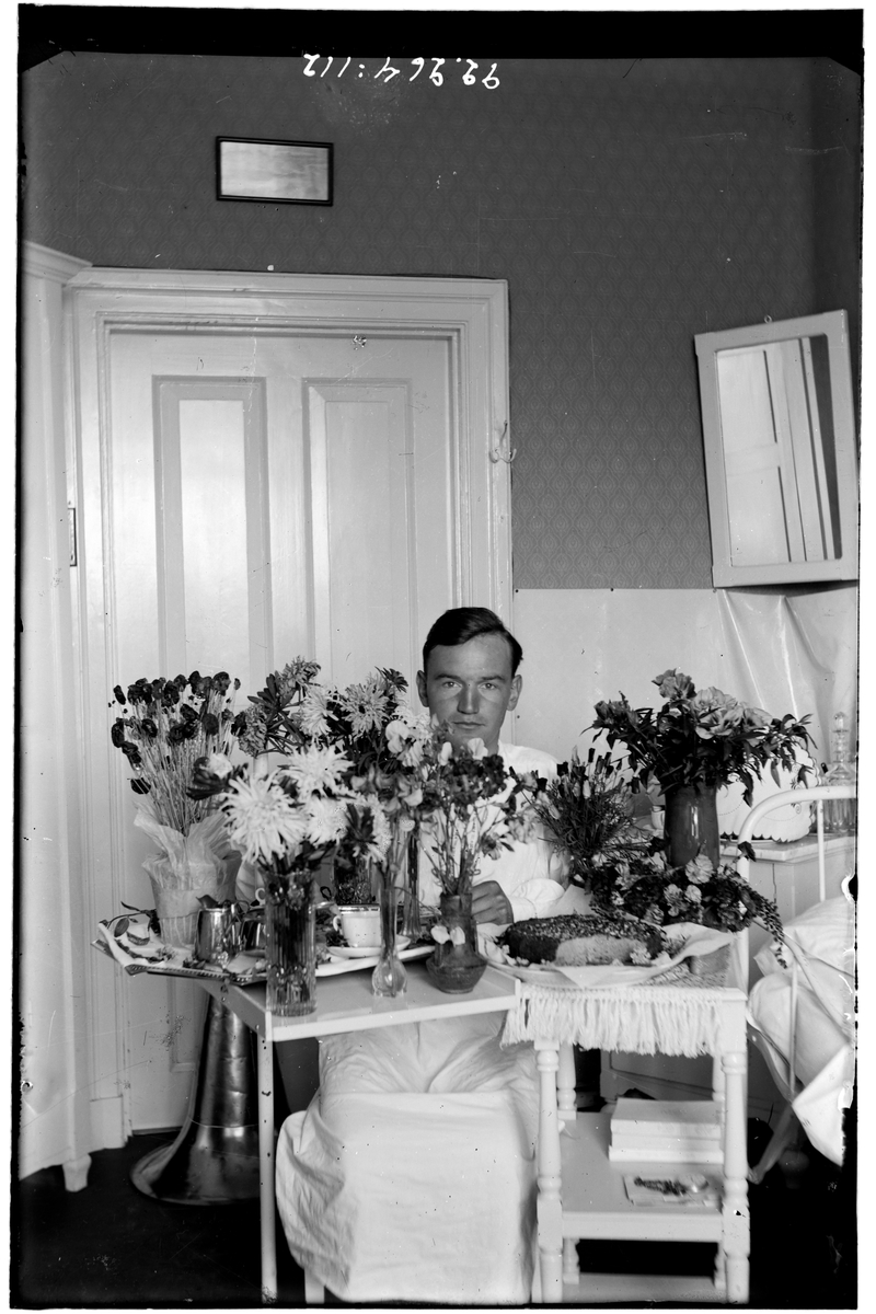 Hålahult sanatorium, interiör, man uppvaktad med blommor och kaffebröd, patient?
