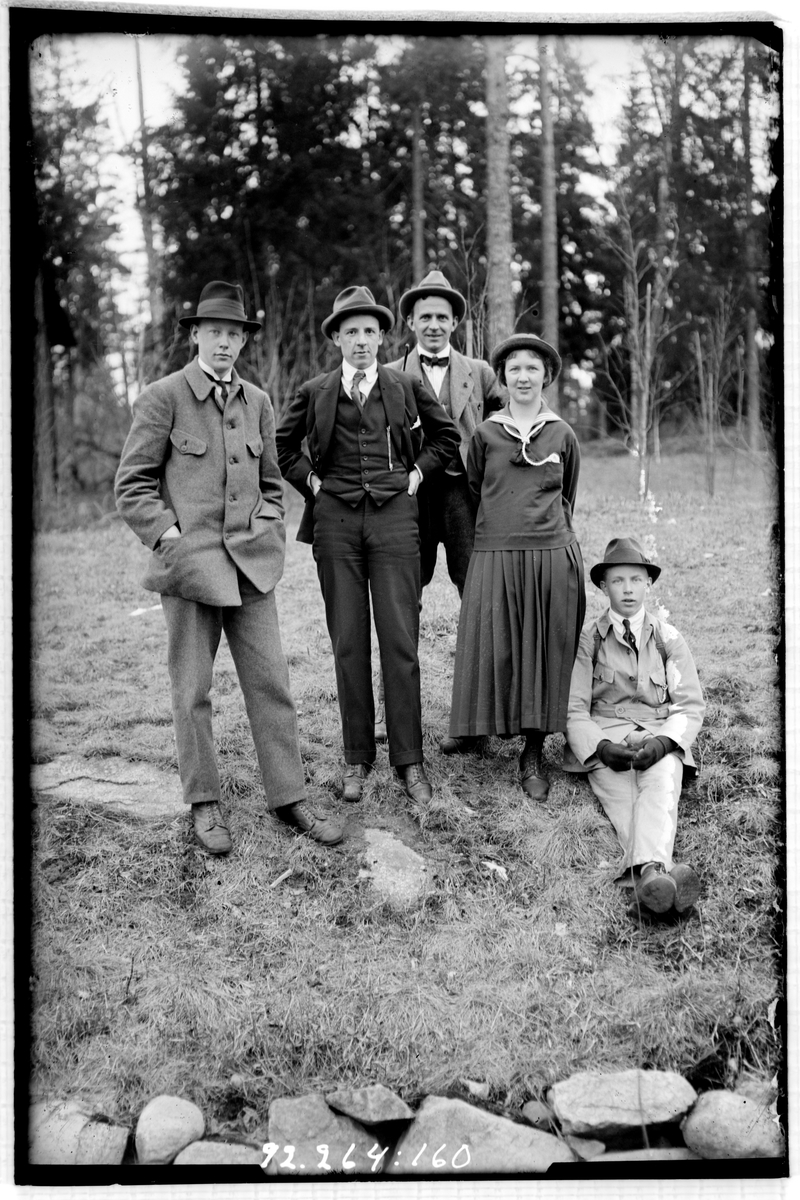 Hålahult sanatorium, exteriör,fyra män i kostym, en kvinna, på gräsmatta skog i bakgrunden.