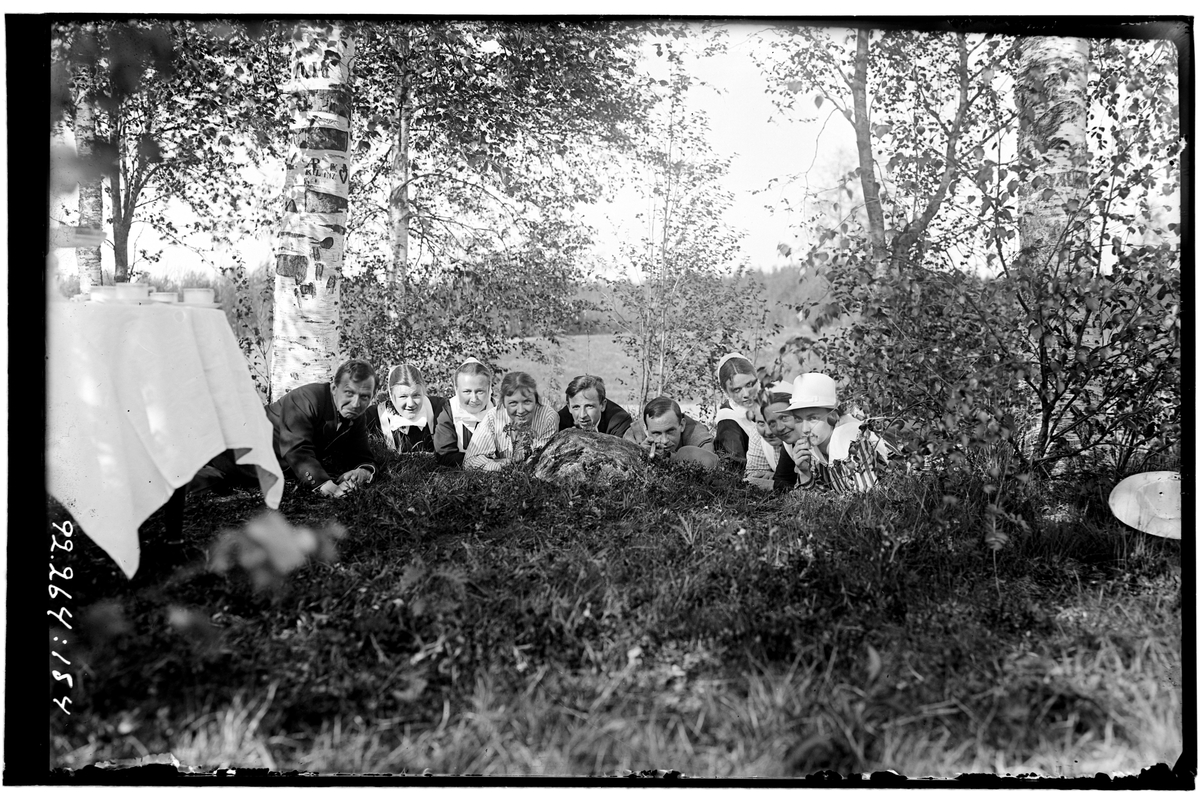 Hålahult sanatorium, exteriör, gruppbild, tre män, sju kvinnor, i naturen vid kaffebord, en annorlunda bild med humor.