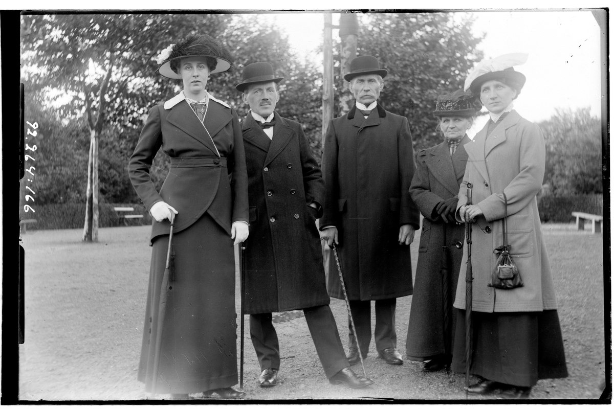Hålahult sanatorium, exteriör, två män, tre kvinnor, uppklädda, på promenad i park?(trädgård)