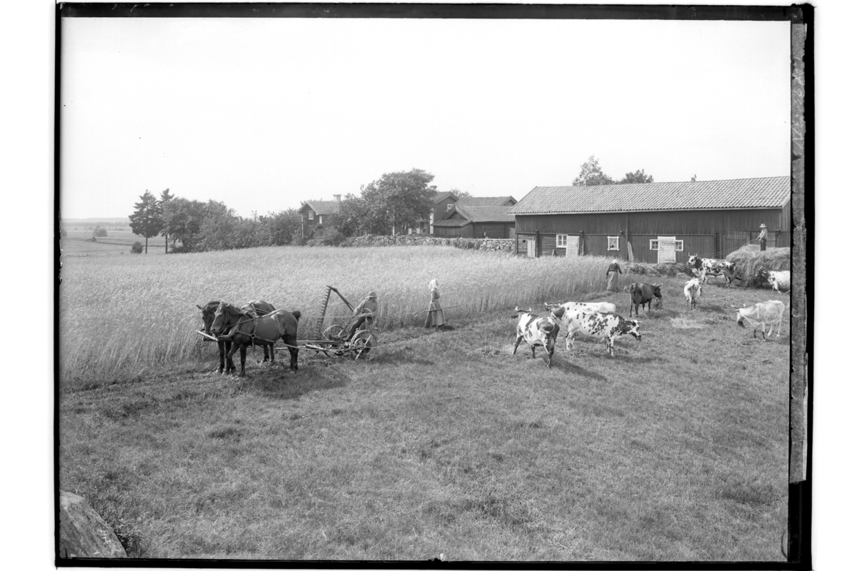 Titel: Två st. boningshus och ekonomibyggnader, oxar spända för skrinda, 2 hästar spända för slåttermaskin, 7 betande kor, 4 personer. Oskar Nilsson