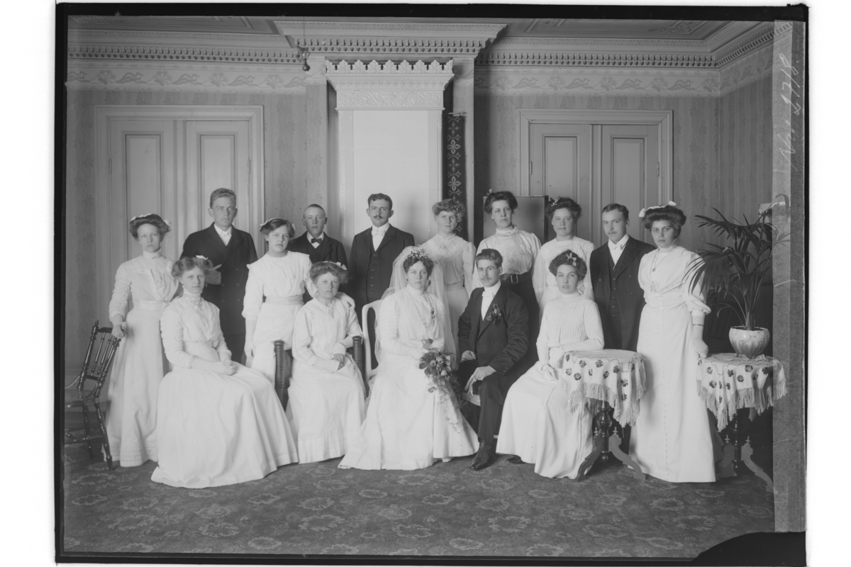 Rumsinteriör. Bröllop. Brudpar och 13 gäster.