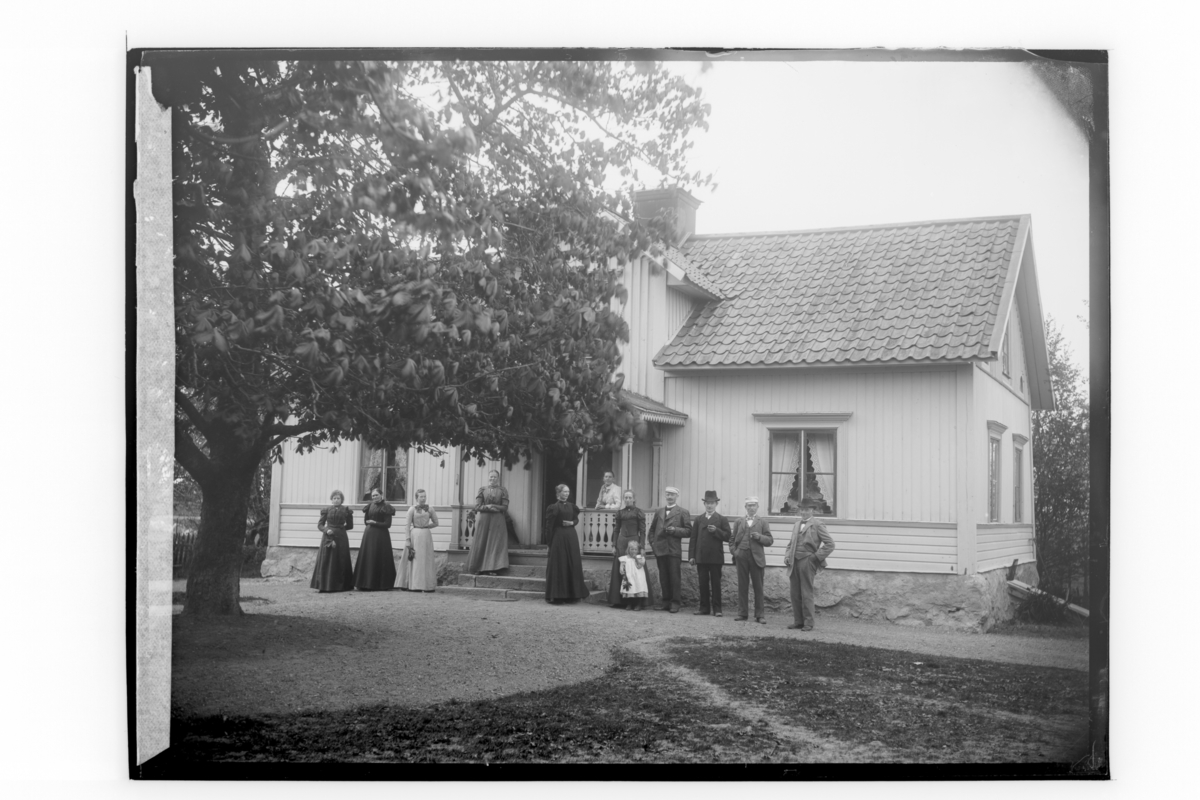 Titel: Bostadshus, 12 personer framför huset. Carl Sahlin