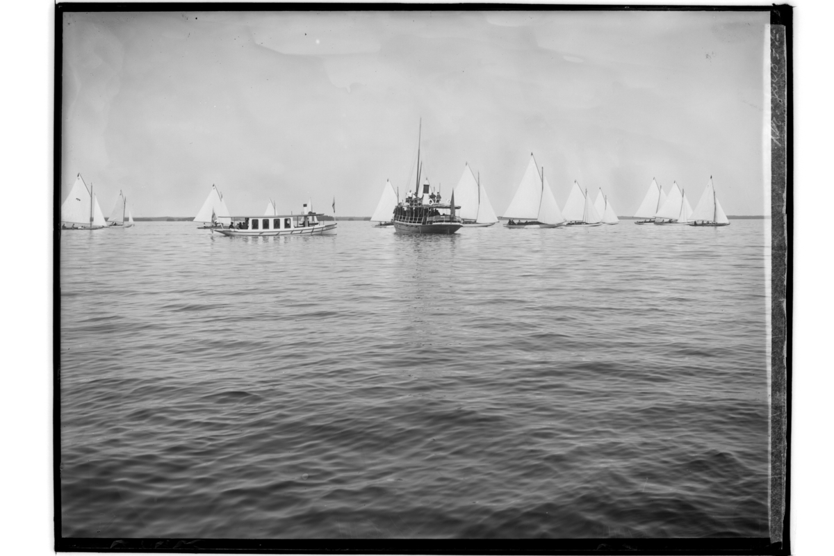 Ångslupen Linnenäs och Ångaren Nerike, 13 segelbåtar.
