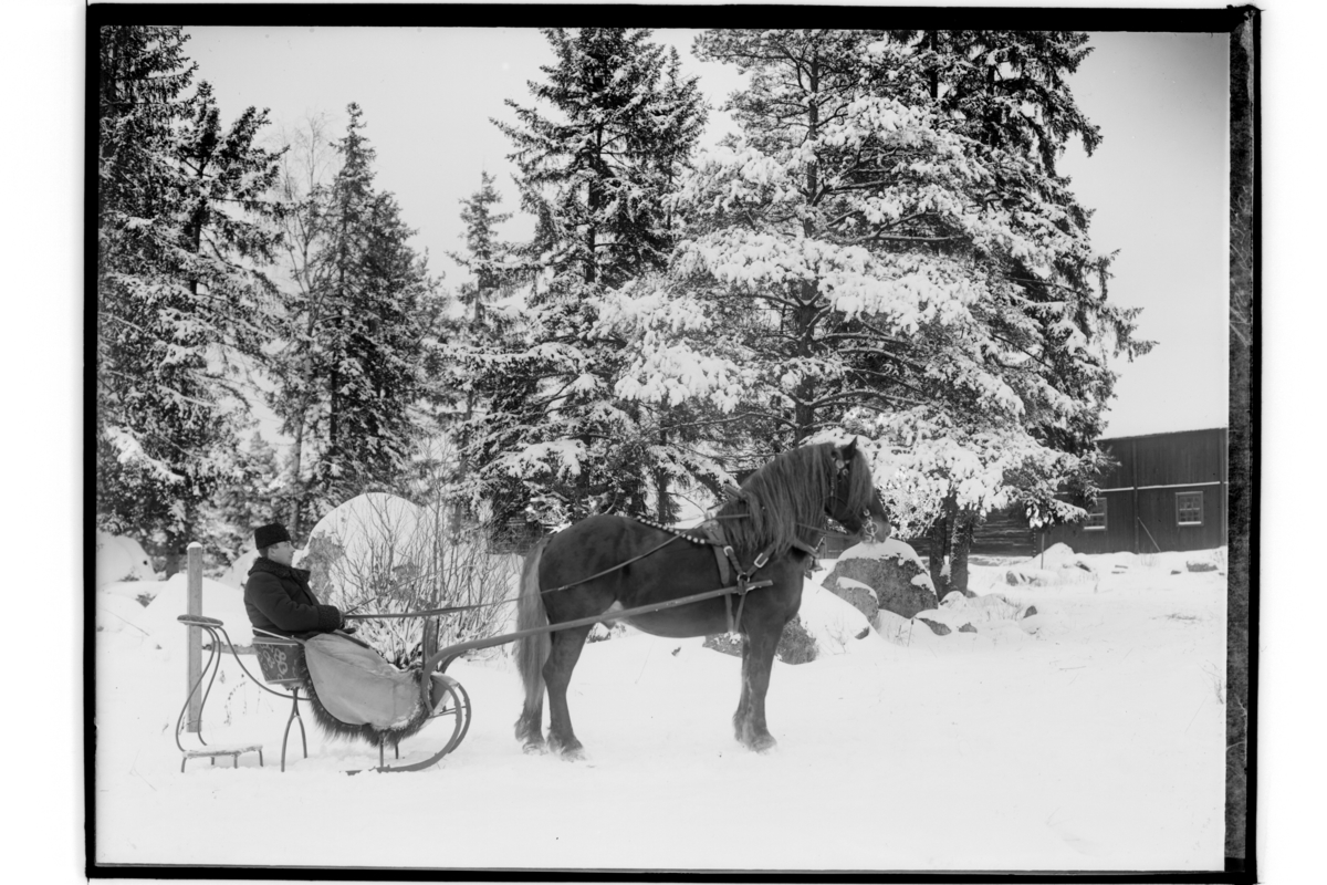 Hingsten Tiss med släde. En man.