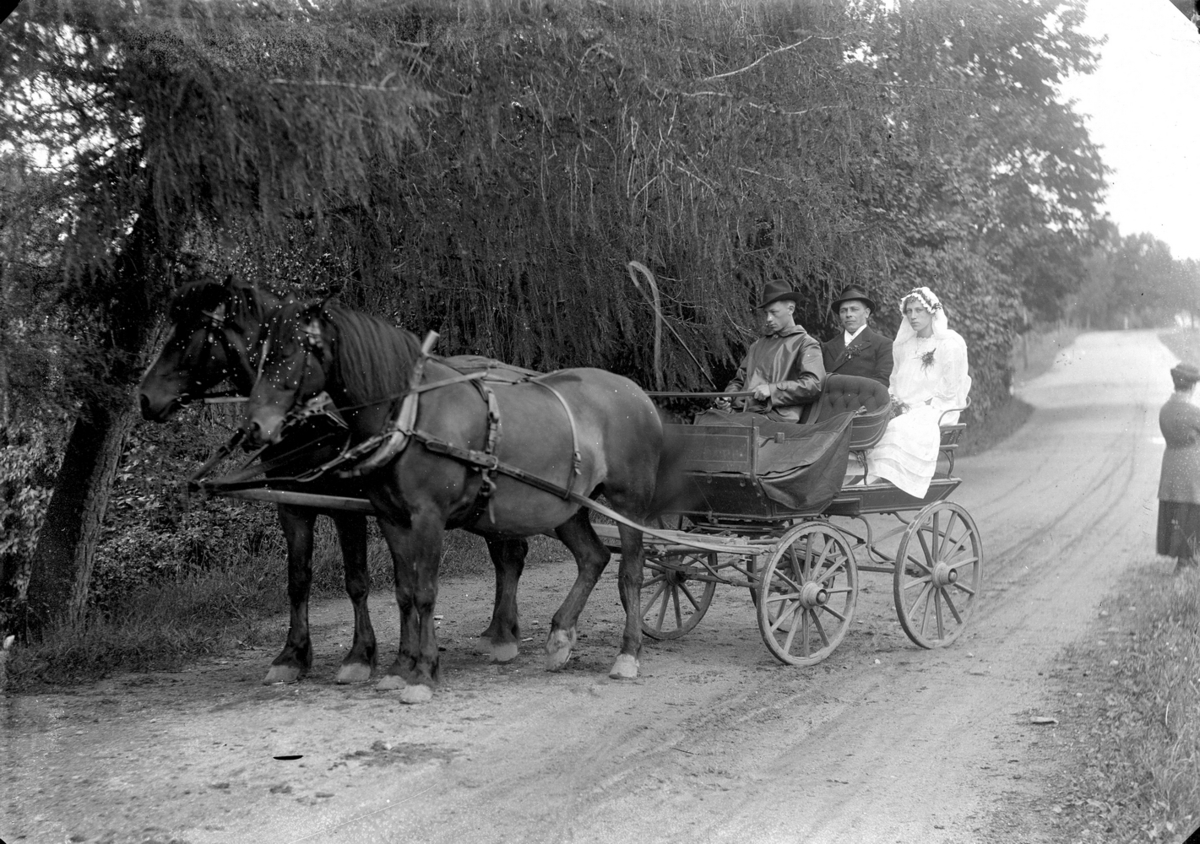 Bröllop, brudpar i vagn spänd för två hästar.