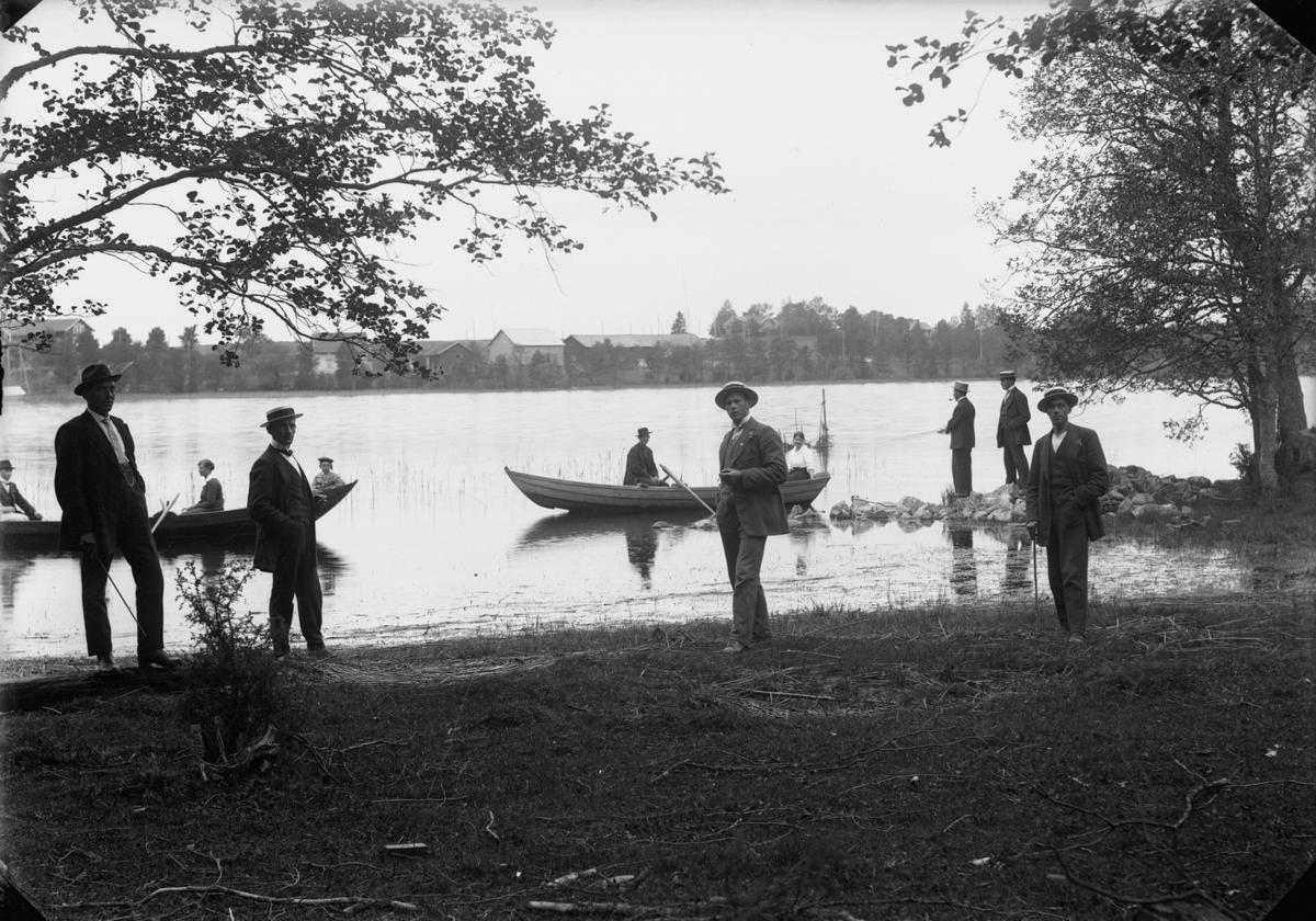 Sjöutsikt, grupp, roddbåtar. Bostadshus i bakgrunden.