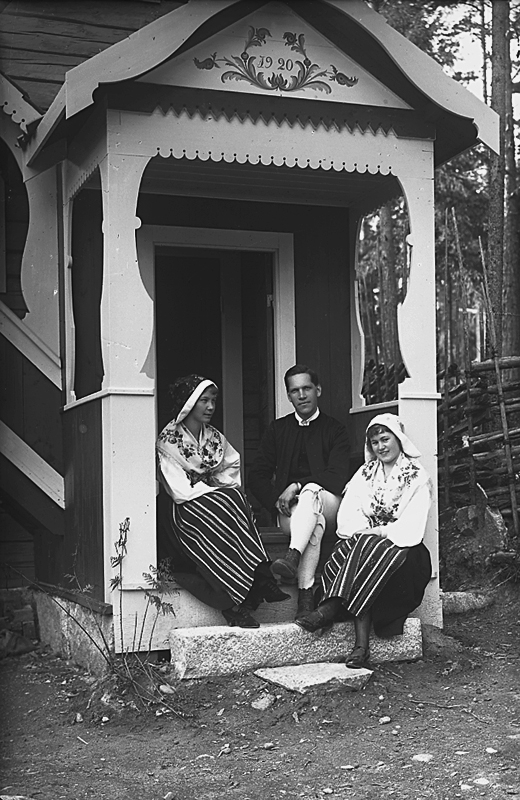 Bostadshus. Grupp tre personer i folkdräkter på trappan till huset.